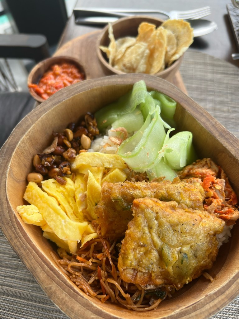 From Chicago, Bali is far, 22 hours of flying, 12 hour time difference, crossing the international date line and the equator far. It’s also exotic and beautiful. And, as I have mentioned in a previous post, Sophie’s family is a joy to be with. Despite the distance, we really looked forward to the trip. We stayed at a jungle resort next to a waterfall that was luxurious and beautiful with the friendliest of staff. The cuisine was delicious with the opportunity to eat local dishes. Finally, there was a great lap pool some 30 meters in length.